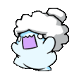 A pixelated light blue cloud creature spins rapidly, appearing dizzy and lightheaded. Features a purple square on its face.