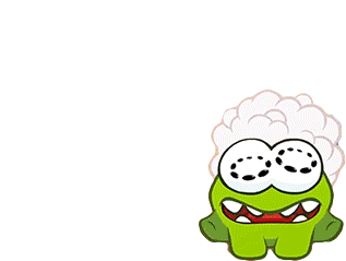 Om Nom, the green character from Cut The Rope, sits looking dizzy and woozy with spiraled eyes and fluffy white hair.