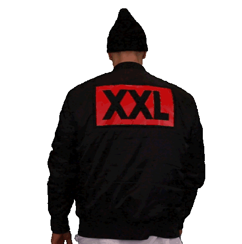 a man wearing a black jacket with the word xxl on it