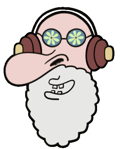 Animated sticker of a cartoon DJ head with a long white beard, headphones, and flower-patterned glasses, grooving to music.
