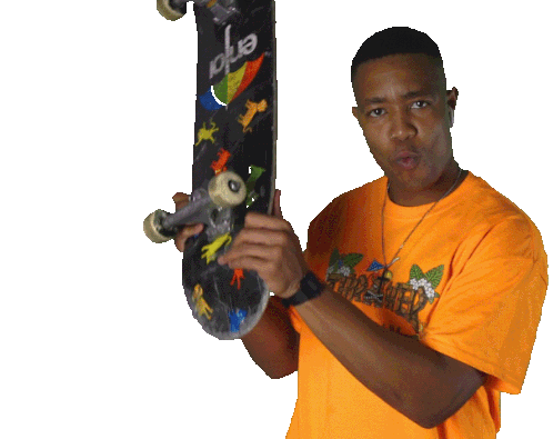 Dj Speedsta holds up a skateboard with colorful graphics, looking directly at the viewer in this hip hop themed sticker.
