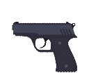 A pixelated dark grey pistol, associated with Dm4uz3 and Foekoe, shown firing with a puff of smoke from the barrel.