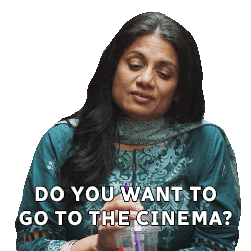 Ellora Patnaik as Raffo asks 'Do you want to go to the cinema?' while holding a drink, inviting viewers to a movie.