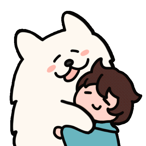 A heartwarming cartoon sticker of a person with brown hair hugging a fluffy white Samoyed dog, showing affection.