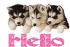 Three adorable husky puppies are featured with a sparkling pink glitter 'Hello' message, perfect for greetings.