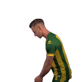 Donny Gorter, wearing an ADO Den Haag jersey, performs a looking out gesture, shielding his eyes.