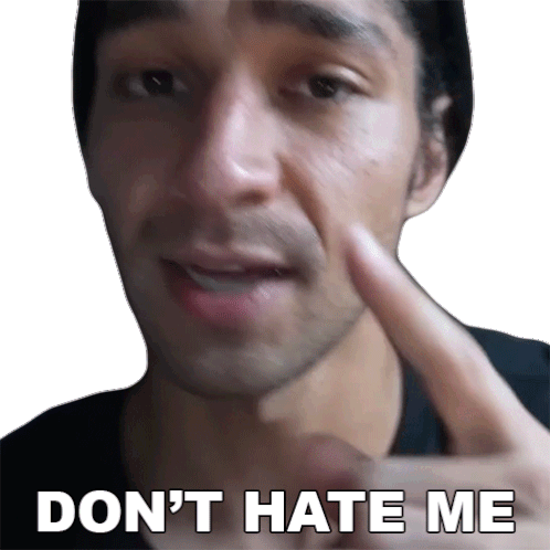 Wil Dasovich looks sad and pleads "Don't Hate Me" in this expressive sticker, perfect for showing remorse.
