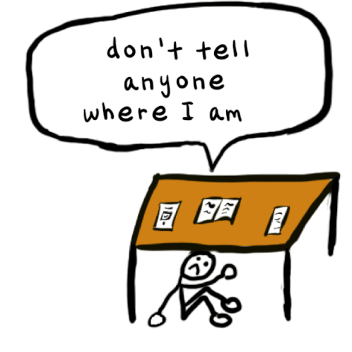 A stick figure hides under a table, looking nervous, with a speech bubble saying 'don't tell anyone where I am'.