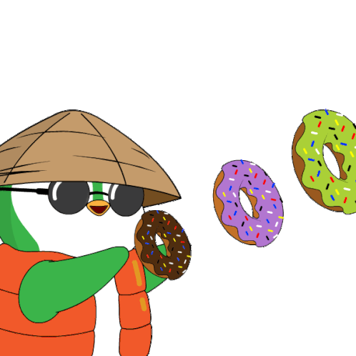Pudgy Penguins character, a cartoon penguin in a conical hat and sunglasses, looks at floating donuts.