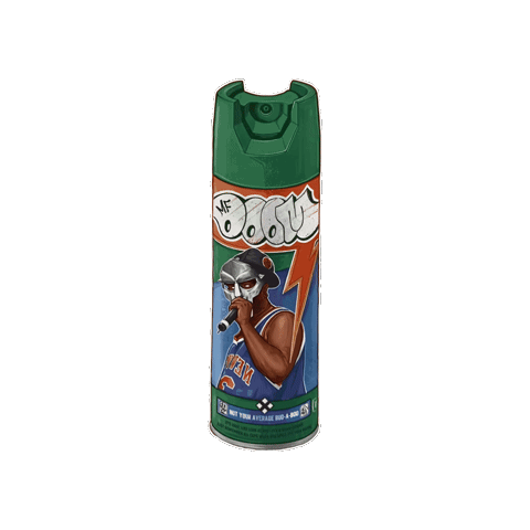 A vibrant green spray can sticker featuring the iconic rapper MF DOOM, holding a microphone with a lightning bolt design.