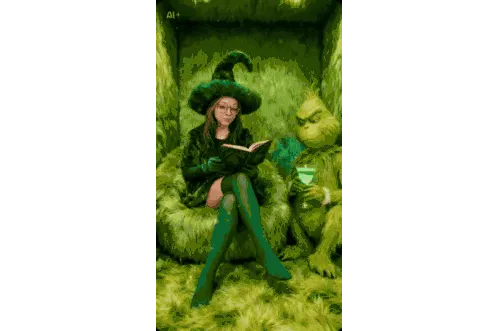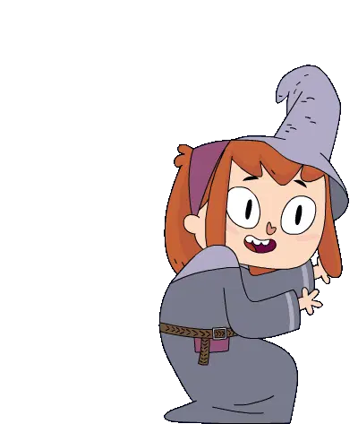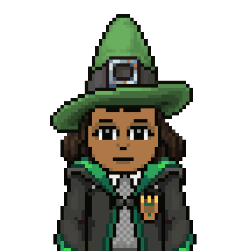 Pixel art depiction of Dora the Explorer dressed as a witch, complete with a green hat and a wand, inspired by Hogwarts.