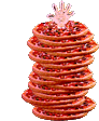 A hand proudly presents a towering stack of three pepperoni pizza slices, associated with Doubledougs. Perfect for pizza lovers.