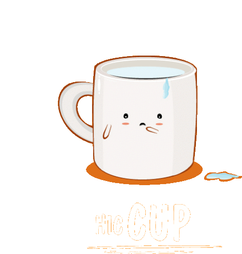 A funny animated sticker featuring a sad, sweating mug of water experiencing a 'hiccup' in a clever wordplay.