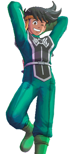 a cartoon character is wearing a green jumpsuit and a black vest with the letter k on it