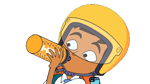 Bittu, the clever cartoon boy from Nickelodeon India, takes a refreshing drink from his orange water bottle while wearing a yellow helmet.