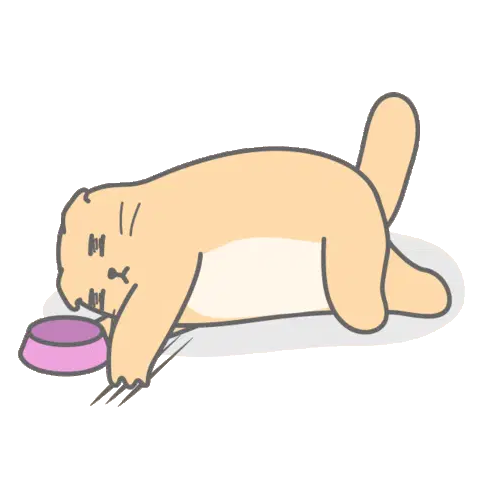 A cute, minimalist cat character with an angry expression, curled up and stretching in this animated sticker.