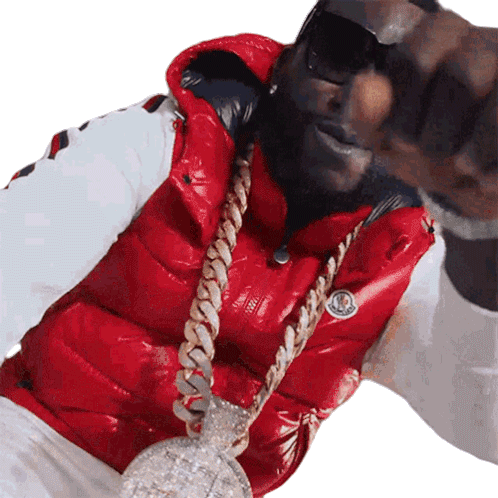 Gucci Mane, the American rapper, points directly at the viewer with a confident and energetic vibe, wearing a red vest and large chain.