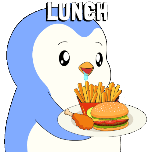 a cartoon penguin holding a plate of food with the word lunch above it