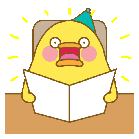A grumpy yellow duck wearing a party hat is trying to read a book at a desk, looking annoyed and possibly drowsy.