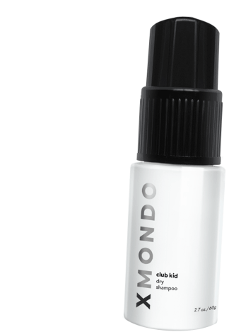 A white bottle of XMondo Club Kid Dry Shampoo with a black cap rotates, showcasing the product for hair care.