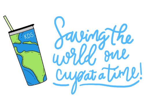 An animated sticker from Ds Kreations featuring a KDS cup with a world map, promoting saving the world one cup at a time.