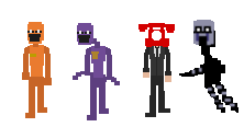 Pixel art sticker featuring characters from Dayshift at Freddy's, including Dave Miller, William Afton, Phone Guy, and the Puppet.