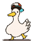 A pixel art duck wearing a hat and goggles dances and vibes with a cheerful spirit.