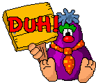 A pixel art purple clown character holds a sign displaying 'DUH', perfect for sarcastic reactions.