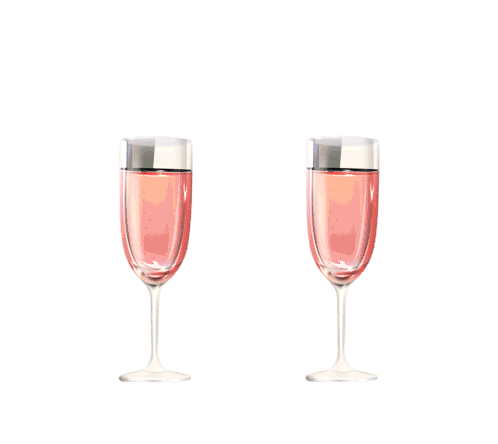 Two champagne flutes clink, followed by a pink splash with the German text 'Sprudel geht immer!' (Sparkling always works!).