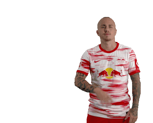 Angeliño, wearing his RB Leipzig jersey, confidently brushes something off his shoulder in a cool gesture.