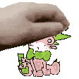 a pixel art of a hand holding a cartoon character with a green bow tie .