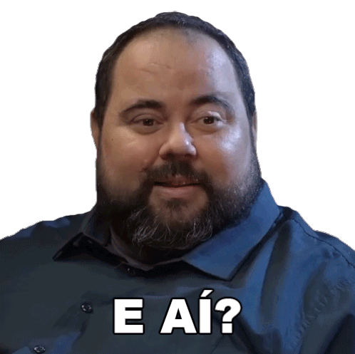 Fabio De Luca from Porta dos Fundos asks 'E Aí?' with a questioning and slightly surprised expression.