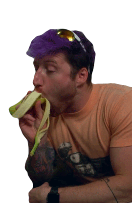 Scotty Sire comically eating a banana, appearing to choke or eat it in a weird, hungry manner.