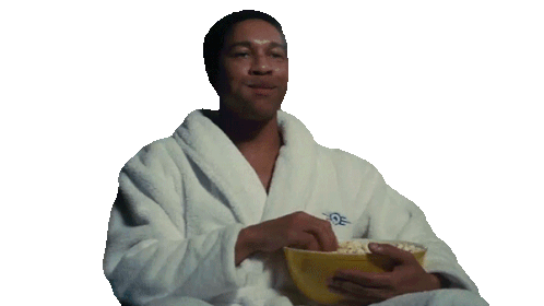 Maximus from Fallout, wearing a white bathrobe, enjoys a bowl of popcorn with a slight smirk.