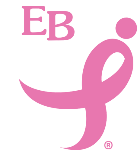 A vibrant pink ribbon, stylized as a figure, with the letters 'EB' and a registered trademark symbol, supporting breast cancer awareness.
