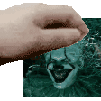 A hand holds a picture of Pennywise the clown in dark water, featuring Eggmum, Hantalcord, and Pat.
