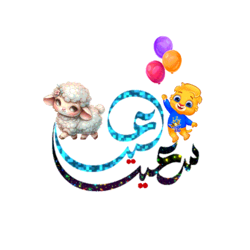 A cute cartoon sheep and a happy boy with colorful balloons celebrate Eid Mubarak, featuring Tawfikiya calligraphy.