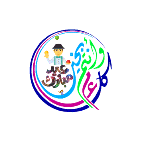 A vibrant Eid Mubarak sticker featuring Arabic calligraphy and a charming juggler character, wishing blessings for the holiday.