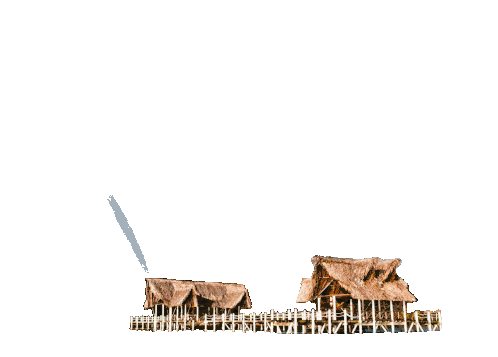 Animated sticker featuring traditional stilt houses with thatched roofs from El Faro, Guatemala, accompanied by dynamic brush strokes.