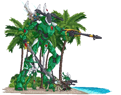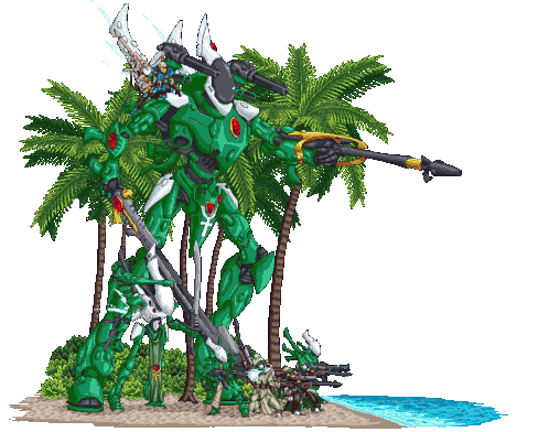 A pixel art scene featuring Eldar Wraithknight and Rangers from Warhammer 40k on a tropical beach with palm trees.