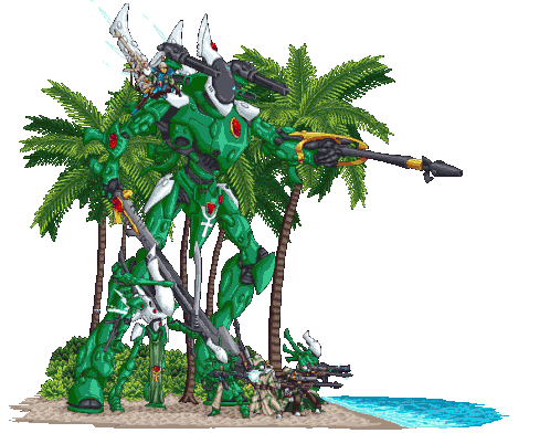 a drawing of a robot standing on a beach with palm trees in the background