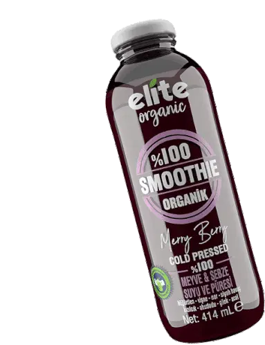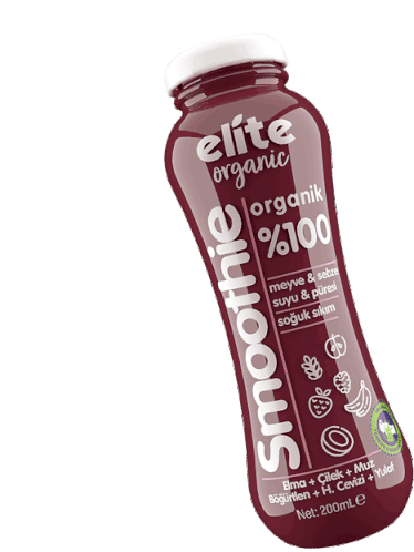 A vibrant purple bottle of Elite Organic Smoothie, featuring fruit and vegetable ingredients like apple, strawberry, and banana.