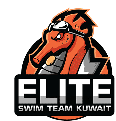 Dynamic logo for Elite Swim Team Kuwait featuring an orange seahorse mascot with goggles.