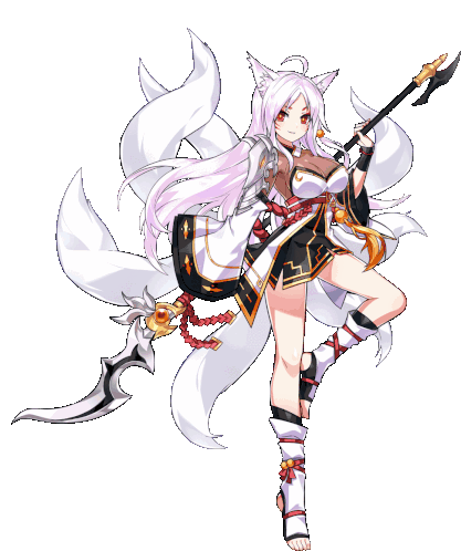 Elsword's Ara Haan, a kitsune girl with a spear, changes her hair and tail color from grey to black.