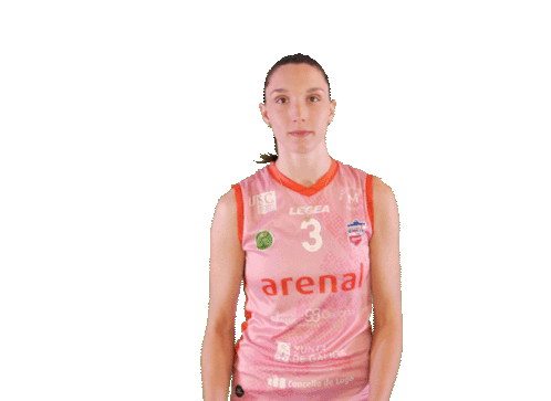 Raquel Montoro, a volleyball player for Emevé, smiles confidently with her arms crossed in her pink team jersey.