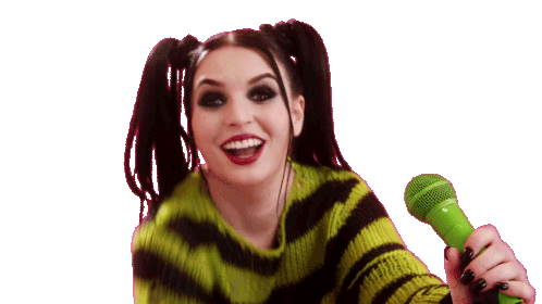 Emma Blackery and Sarahmcfadyen smiling brightly while holding a green microphone, full of energy and excitement.