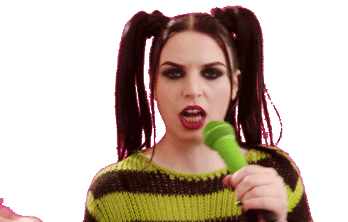Emma Blackery, with pigtails and a striped sweater, sings into a green microphone, animated and expressive.