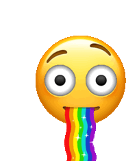 An animated emoji sticker featuring a yellow smiley face with wide eyes, spewing a vibrant rainbow from its mouth.
