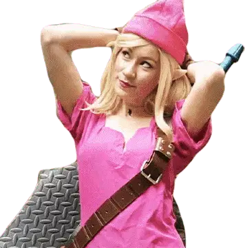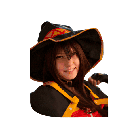Emokitten cosplaying as Megumin from Konosuba, smiling brightly in her iconic wizard hat.
