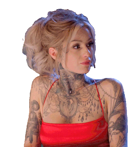 a woman with a lot of tattoos is wearing a red dress